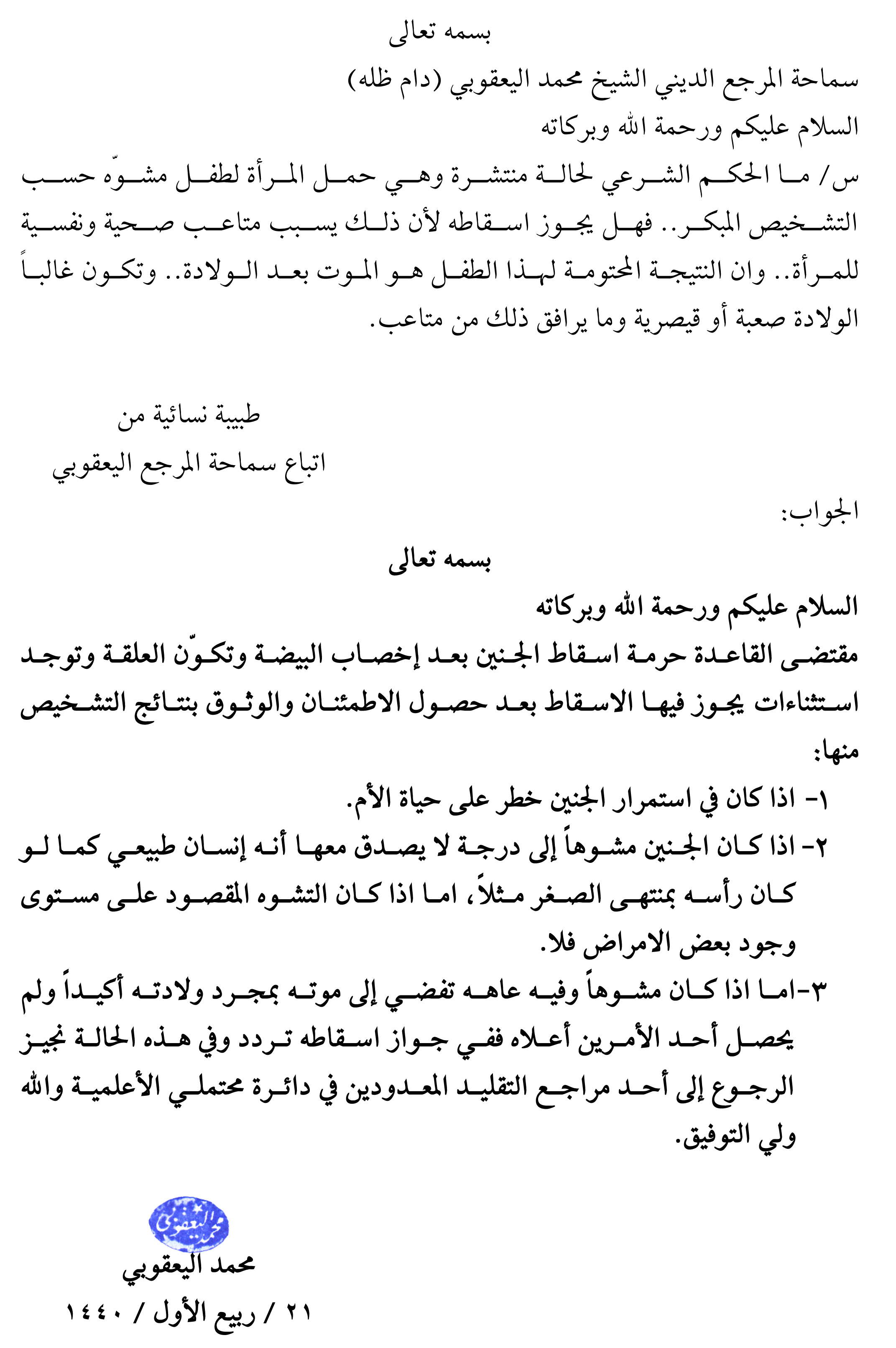 3- اما اذا كان مشوهاً وفيه عاهه تفضي إلى موته بمجرد ولادته أكيداً ولم يحصل أحد الأمرين أعلاه ففي جواز اسقاطه تردد وفي هذه الحالة نجيز الرجوع إلى أحد مراجع التقليد المعدودين في دائرة محتملي الأعلمية والله ولي التوفيق.